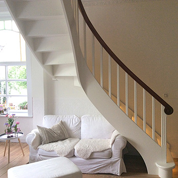 For at udnytte førstesalen var det nødvendigt at placere en trappe i stuen. Udfordringen var at finde en trappe, som kunne passe ind, som en naturlig del af stuens indretning og stil. Resultatet af søgningen blev en smuk krumningstrappe med mange fine detaljer – så nu er der igen plads nok til hele familien.
