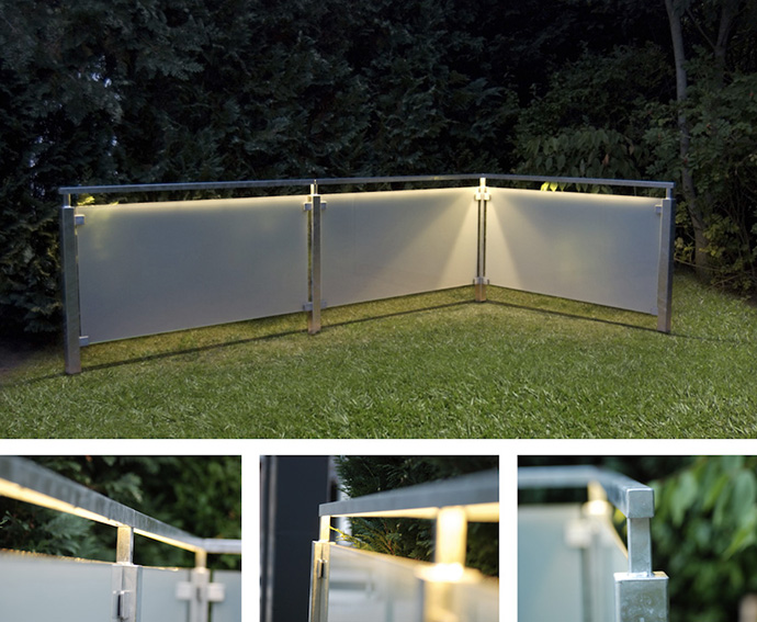 Glashegn laves som standard i galvaniseret stål med sider af matteret glas. Kontrasten mellem det rustikke zink og det lette glas giver en udtryksfuld og elegant kombination. En oplagt løsning omkring en flot terrasse. Som tilvalgsmulighed kan din afskærmning leveres med integreret LED-lys.