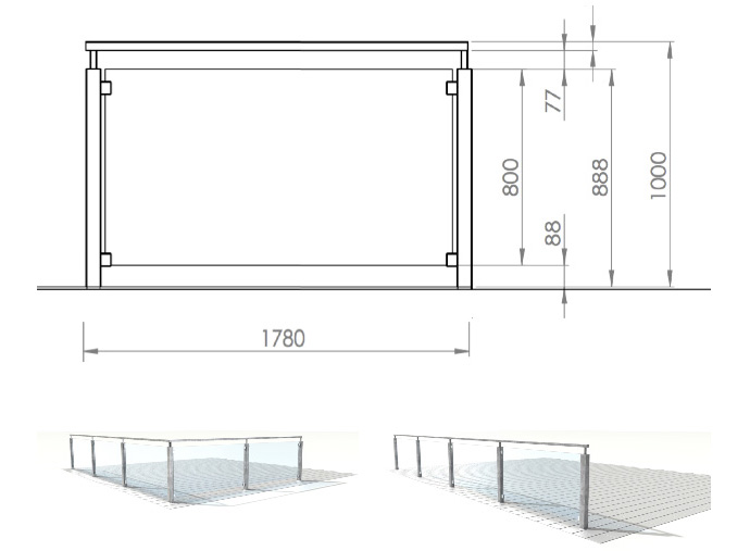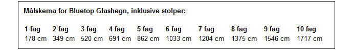 Glashegn kan som standard leveres i disse mål. Til systemet medgår hærdet glas i målet 160 x 80 cm. Det kan monteres på linie, i vinkel, eller i U-form. Spørg gerne Bluetop, hvis du ikke finder din løsning med disse mål eller med de vinkelrette hjørner.
