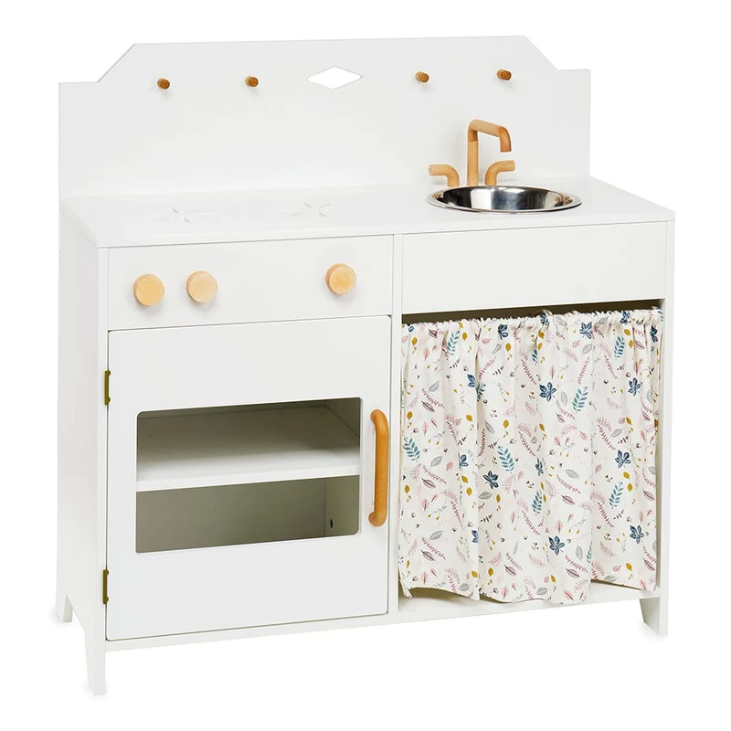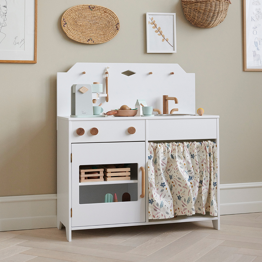Består af en lille ovn, 2 kogeplader, 3 drejelige knapper, 4 knager til redskaber, en håndvask i metal og et køkkenskab bag det fine Cam Cam gardin. Gardinet er vendbart og præsenterer to forskellige print, Pressed Leaves Rose på den ene side og Forest på den anden, så du kan style det efter din families ønsker.
