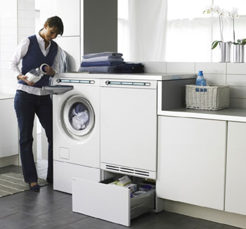 Sokkelskuffen fra ASKO Vølund giv ikke kun god opbevaringsplads, men også et sted at sortere tøjet. Sokkelskuffen giver samtidig maskinerne en god arbejdshøjde.