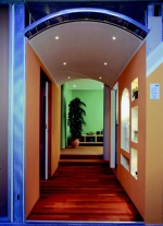 Se på billederne, hvor flot denne smalle entre er blevet. Her har man lavet et buet loft med indbyggede spots i de vandrette vægfriser.