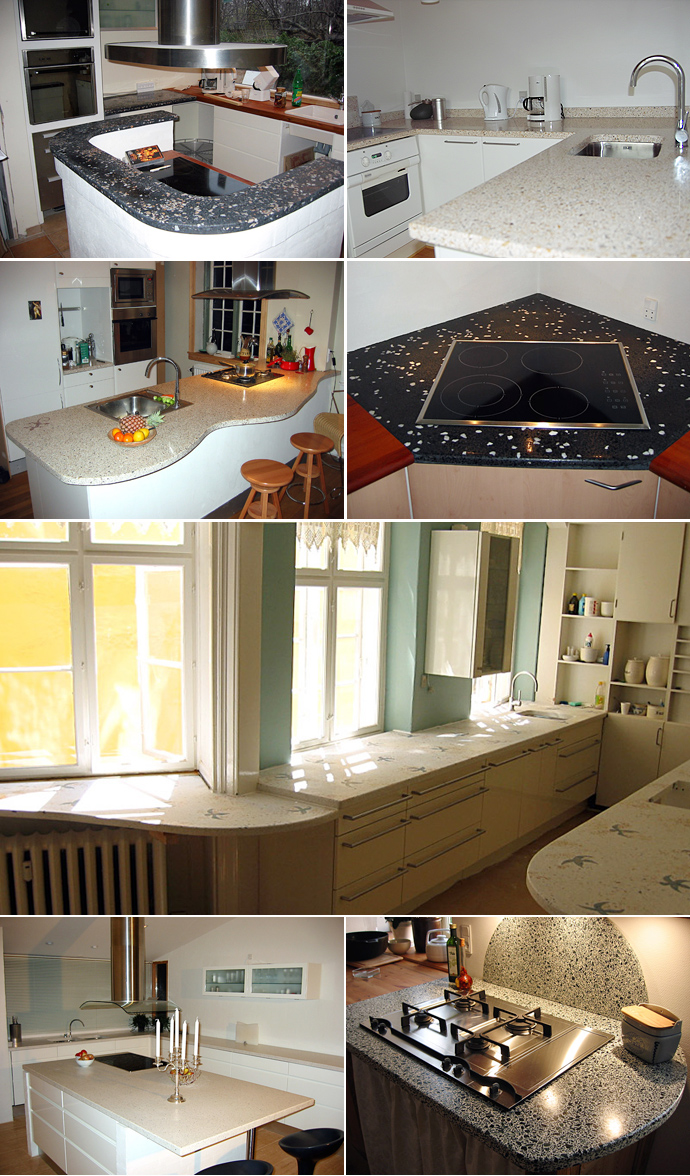Køkkenborde med udskæring til vask o. lign., vindueskarme, spiseborde, sofaborde, telefonborde, blomsterborde, haveborde og -bænke, gasborde, udekøkkener og grillborde, pejseplader og meget mere.