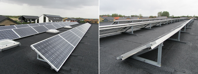 Ny type stativer for solceller monteret på fladt tag, stativerne er fremstillet i vinkeljern og derefter varmtgalvaniseret, laves i forskellige hældingsgrader 25 – 30 og 35 grader.