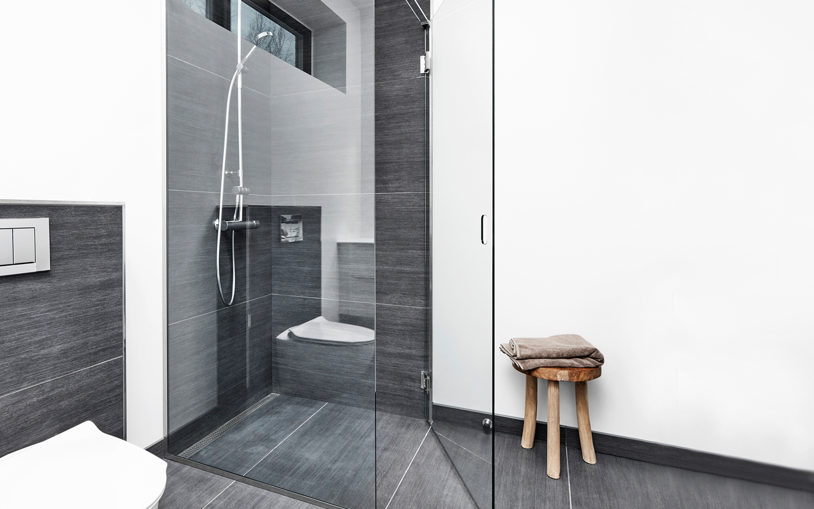Mangelfulde vådrumsmembraner, utætte installationer og forkert installerede afløb koster hvert år danske boligejere flere tusind kroner Samtidig er badeværelset det rum i boligen, hvor der er størst risiko for vandskader. Derfor var det vigtigt for TC Anlæg at få en gennemført sikker løsning til boligens dyreste rum. De rådførte sig med VVS’eren på projektet for at få en sikker og æstetisk løsning. Her var anbefalingen at bruge unidrains GlassLine løsning til de nye badeværelser.