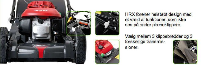 Hondas HRX plæneklipper har VST fremdrift, er let og behagelig at klippe med. Letstartende og meget støjsvag med ca. 30% mindre støj end en traditionel plæneklipper på grund af specielkonstrueret kniv- og klippechassis. “Smart Drive” & knivkobling.