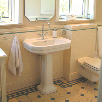 Da Tanja Foged selv skulle modernisere gik hun således den modsatte vej. Hun valgte moderne sanitet og fliser, men i en stil, der respekterede, at huset oprindelige er fra 20’erne. Resultatet er gulvvarme, termostathaner og væghængt toilet i et badeværelse, der ser ud, som om det er originalt fra 1928. Mosaikhjørnet giver mulighed for at vælge det nostalgiske, det historiske, det rustikke – det, der passer til huset.