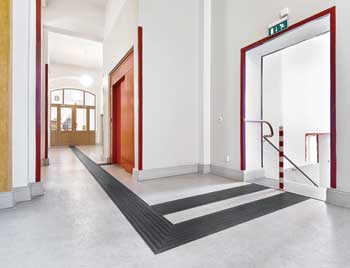 Tarkett har allerede i dag badeværelsesvægge med rigtige kontraster mod den hvide farve, men i marts lanceres en taktil ”sti”, Tactile strip. Det er en 305 mm bred strimmel med riller, der kan nedfældes i den eksisterende eller nye belægning. Det kan også tapes eller limes til den eksisterende belægning. Med sine riller og kontrastfarver, så fungerer det både som en taktilt og visuel ledelinje. Den findes både i mørke og lyse nuancer, og der er i alt fem forskellige.