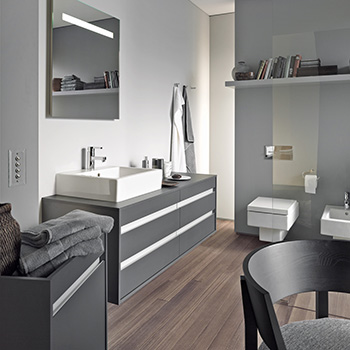 Badeværelsesskabs- og skuffefronte fra Duravit i mørk antracit giver flot kant og kontrast til det hvide keramik.