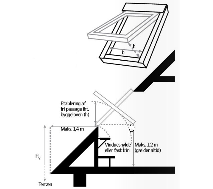 h = Redningsåbningens højde, under 10,8 m fra terræn = min. 0,6 m