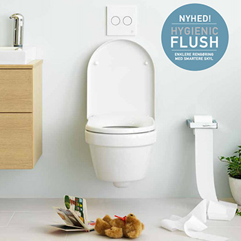 Hygienic Flush er en revolutionerende skylleteknik som giver optimal hygiejne ved hvert skyl. Hygienic Flush letter rengøringen og øger hygiejnen på dit toilet. Skyllet gør effektivt rent og det innovative design med lige flader på wc-skålen levner ikke plads til at snavs kan få fæste. Den åbne skyllerand forenkler rengøring og minimerer behovet af stærke.