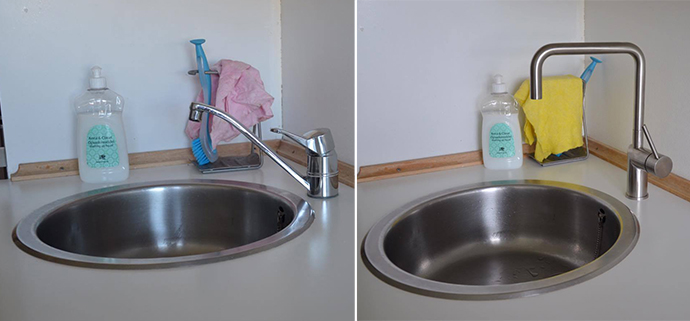 Vandhaner fra Blanco er monteret med et sparefilter, der sikrer, at vandforbruget holdes lavt, idet vandet bliver blandet med luft, inden det forlader vandhanen. Ikke nok med at produkterne er miljøvenlige, så ser de også ret godt – Se blot før- og efterbilledet i artiklen.