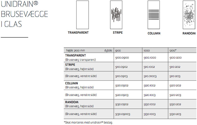Med unidrain®s brusevægge skabes æstetiske løsninger, hvor glasset er monteret i en elegant profil af børstet rustfrit stål, der sikrer et tidløst design. Brusevæggene står derved i naturlig forlængelse af det minimalistiske design, som er karakteristisk for unidrain®s gulvafløb.