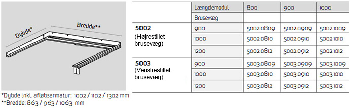 Det faste modul passer til brusevægge med dybde på 900/1000/1200 mm og til brusenicher i bredderne 800/900/1000 mm.