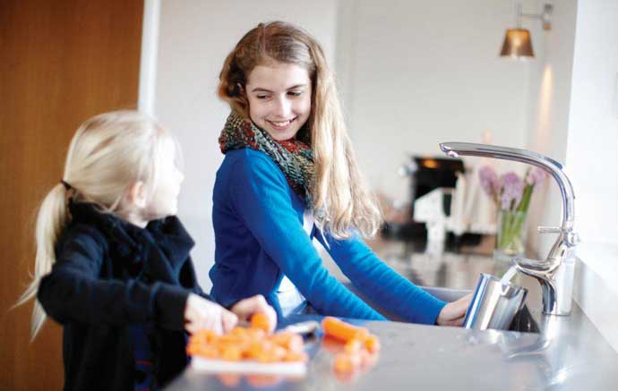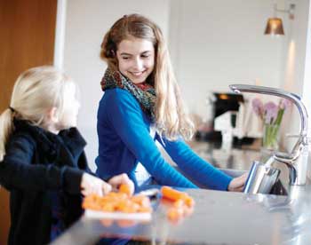 Da vandhanen i køkkenet skulle skiftes ud, faldt familien Topp for en funktionel løsning, der både sparer vand og dermed penge – og gør arbejdet i køkkenet nemmere.