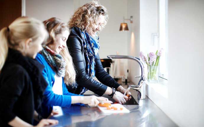 Ligesom hun deler madlavningen derhjemme med Søren, deler de også glæden ved den nye vandhane, der både har en berøringsfri og almindelig åbne-lukke hanefunktion.