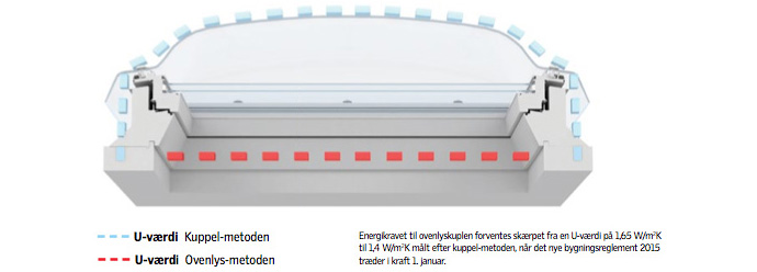 Ved sammenligning mellem produkter er det derfor væsentligt at sikre, at beregningsmetoderne er de samme. Når Bygningsreglementet opdateres 1. januar 2015, forventes det, at energibestemmelserne skærpes væsentlig. Fra 1,65 W/m2K til 1,4 W/m2K målt efter kuppel-metoden.