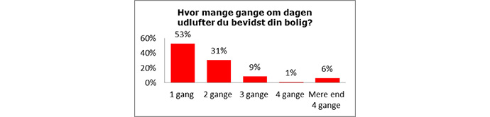 Desværre er vi stadigvæk ikke gode nok til at lufte ud i vores boliger så ofte og i så lang tid, som eksperterne anbefaler. Fire ud af fem danskere udlufter bevidst boligen dagligt, men det er kun lidt under halvdelen, der udlufter nok. Det viser en ny VELUX rundspørge omkring danskernes overvejelser om miljø og indeklima.