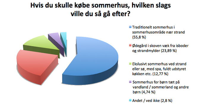 Undersøgelsen afslører også en stigende interesse for ødegården, da hver femte svarer, at de ville købe en ødegård i skoven væk fra isboder og strandmylder. Kun 13 procent går efter luksussommerhuset, og under 5 procent har lyst til et ”børneparadis”, hvor vandland, sommerand, isboder og andre børn spiller hovedrollen.