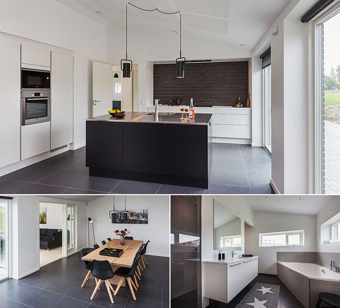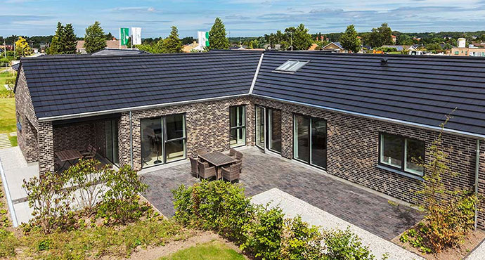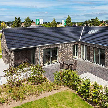 Et klassisk hus og alligevel en stram arkitektur. Her er intet udhæng på taget, hvilket i kombination med murede facader og træ/alu-vinduer giver en løsning som næsten er vedligeholdelsesfri.