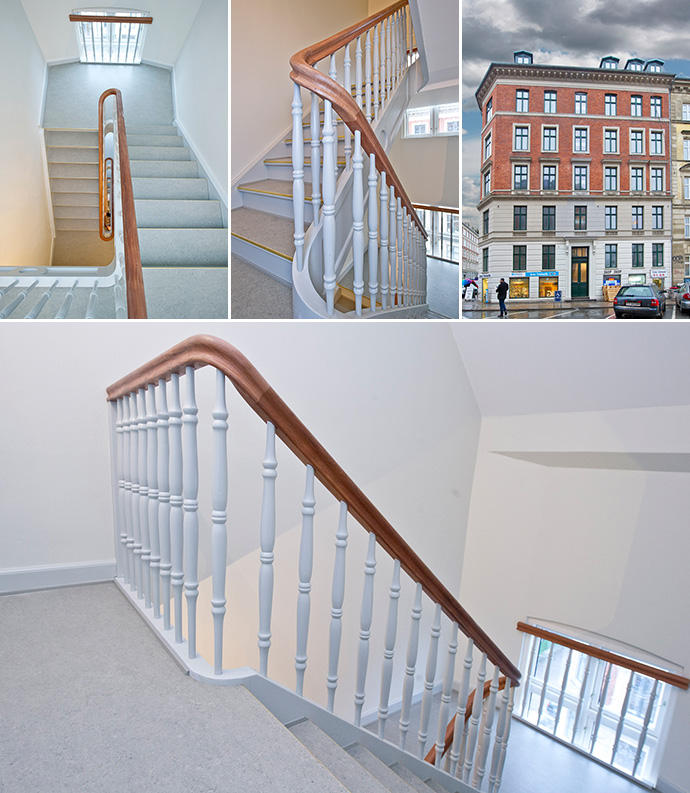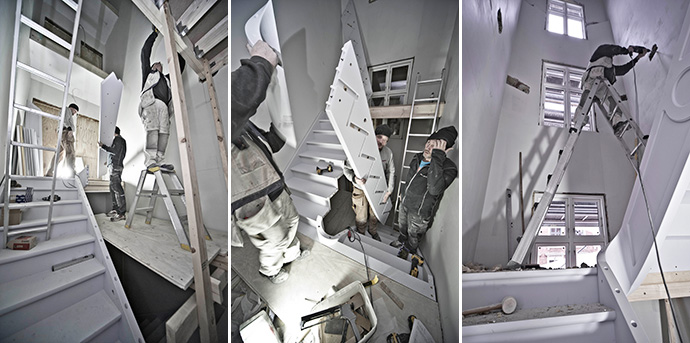 De enkelte trappeforløb blev bygget på fabrikken i Jylland, men håndværkerne måtte montere og bygge hver repos på stedet. Det blev besværliggjort af de trange forhold, og trappeelementerne blev opbevaret i kælderen. Men stille og roligt kom håndværkerne op til femte. sal – trin for trin fra kælder til kvist.